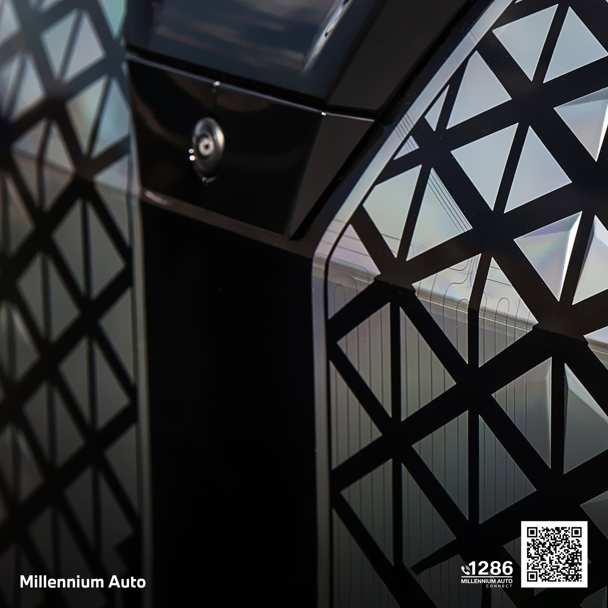 1) กระจังหน้ารูปไตคู่ดีไซน์ใหม่สำหรับยนตกรรมพลังไฟฟ้า ที่ปิดทึบเพิ่มแอร์โร่ไดนามิกส์ ติดตั้งอินเทอร์เฟซไฮเทค มัลติฟังก์ชั่นสำหรับระบบช่วยเหลือการขับขี่ขั้นสูง กล้อง เรดาร์ และเซนเซอร์อื่นๆ ถูกรวมไว้เบื้องหลังพื้นผิวโปร่งใส และยังมีหัวฉีดน้ำที่ซ่อนไว้สำหรับโผล่ออกมาสเปร์ยน้ำล้างกล้องให้สะอาดเอี่ยม