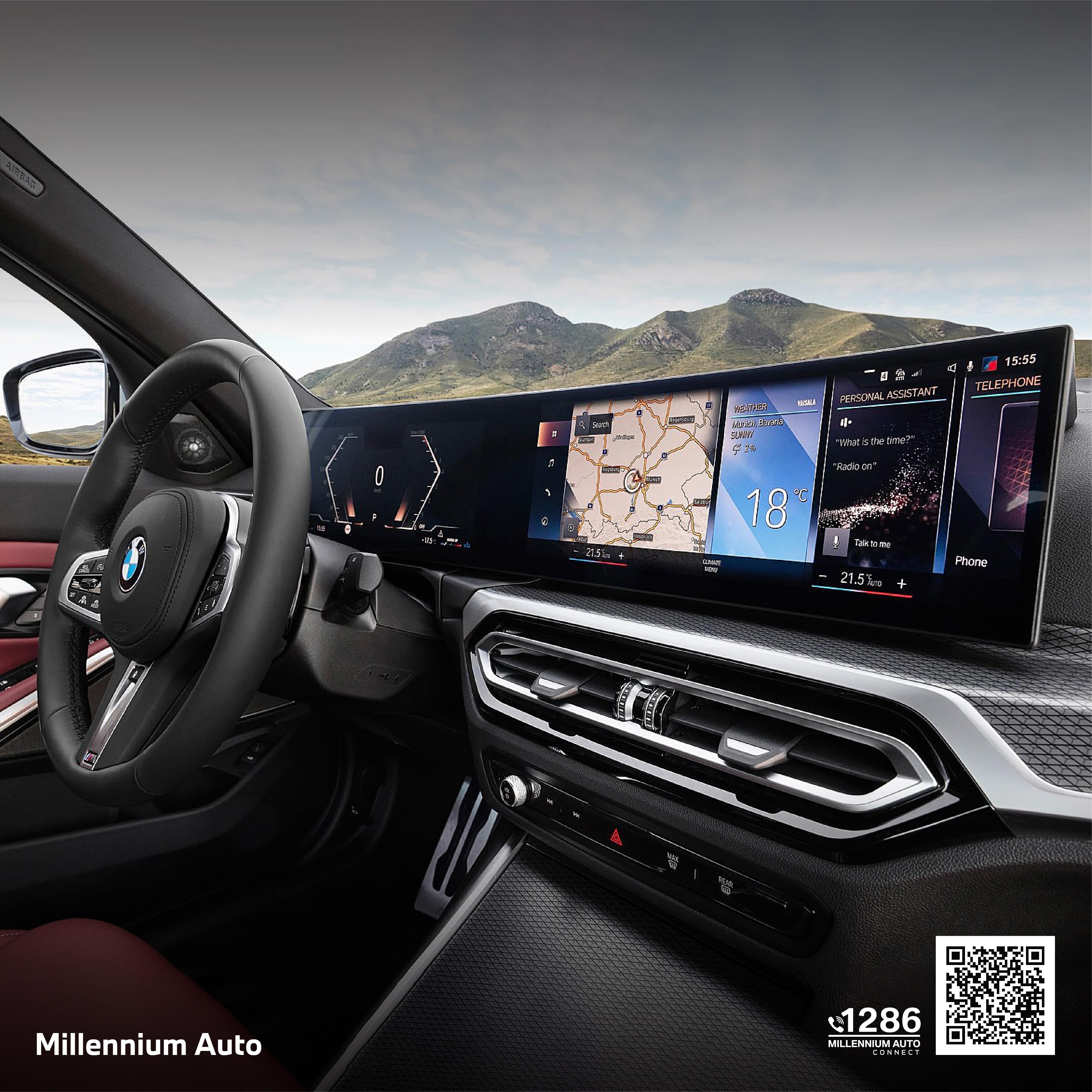 เปิดประตูเข้าไปในห้องโดยสาร ที่เห็นเด่นชัดถึงการเปลี่ยนแปลงตั้งแต่สัมผัสแรกของ BMW 3 Series LCI คือการเปลี่ยนมาใช้หน้าจอ Display ยาวโค้ง (BMW Curved Display) ที่ประกอบด้วยแดชบอร์ดดิจิตอลขนาด 12.3 นิ้ว และ หน้าจอสัมผัสขนาด 14.9 นิ้ว รองรับระบบ iDrive 8.0 เวอร์ชั่นล่าสุด ที่อัพเดทกันด้วยระบบ 5G ให้ความรู้สึกแบบเดียวกับนั่งอยู่ในรถไฟฟ้า I4 หรือ iX