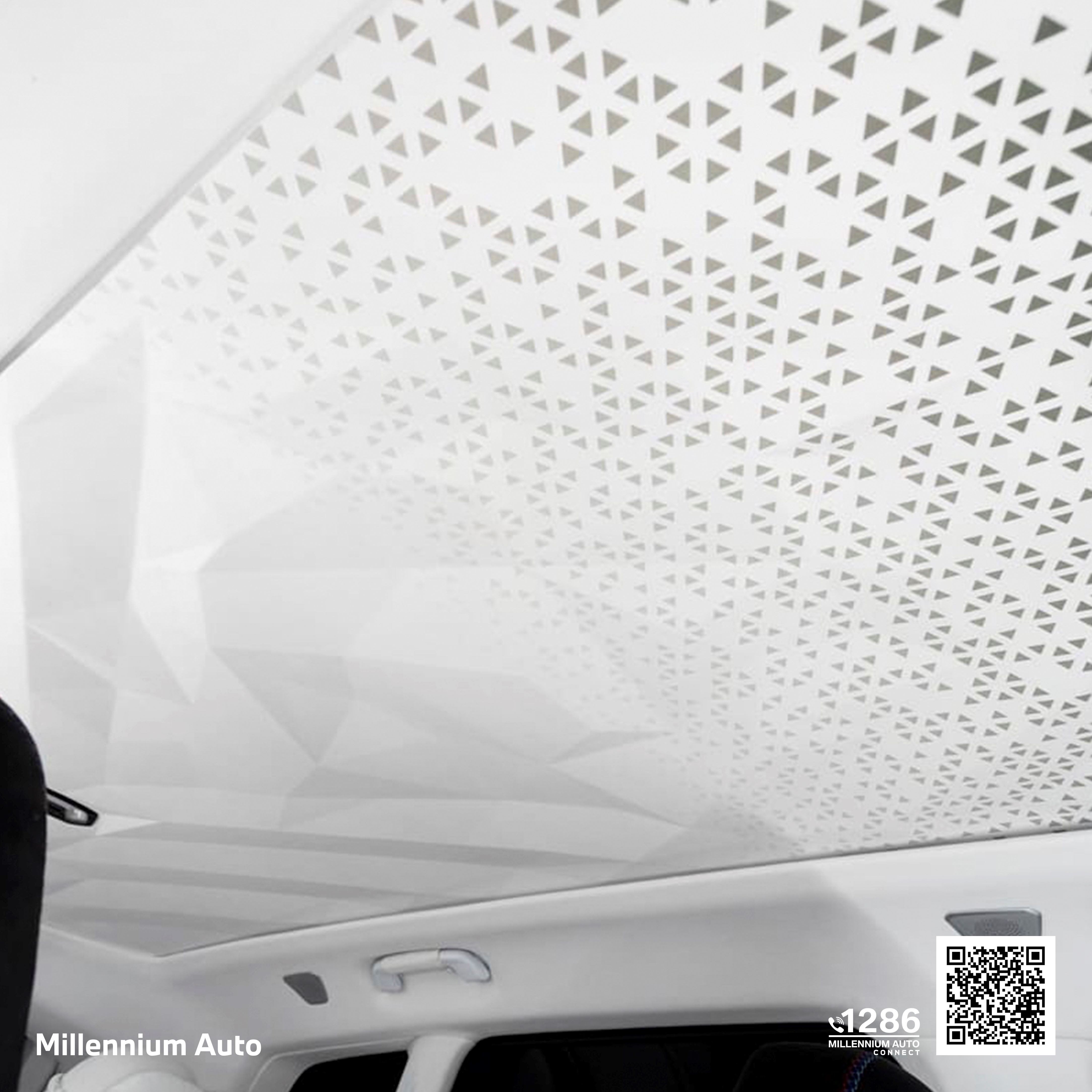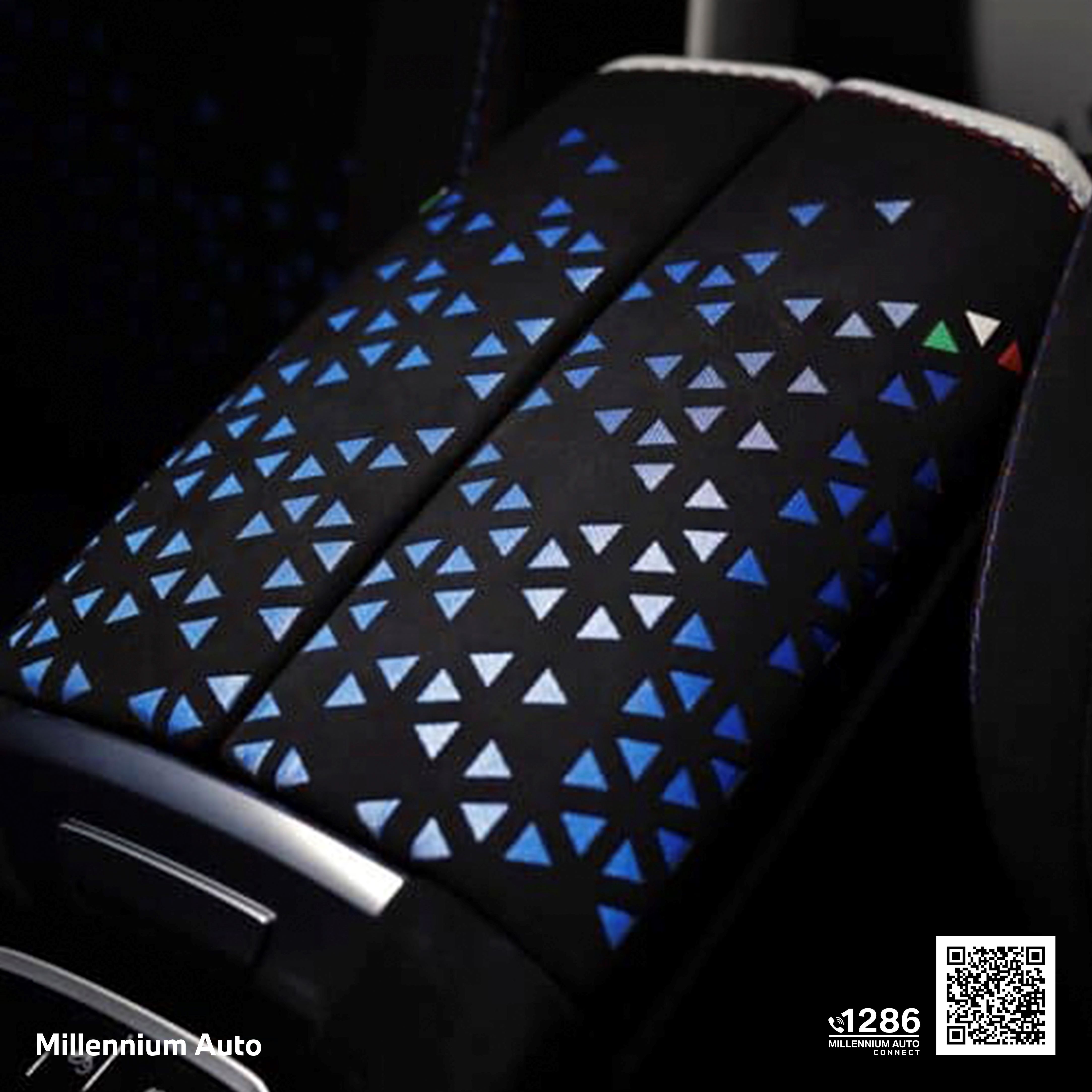 ภายในห้องโดยสารใช้ Alcantara สีดำและสีขาวน้ำแข็งตัดกัน พร้อมลวดลายเจาะรูด้วยเลเซอร์บนพื้นหลังสีน้ำเงิน สร้างบรรยากาศหรูหราและเป็นเอกลักษณ์ หลังคาตกแต่งด้วย Alcantara สีขาวพร้อมลายพิมพ์ดิจิทัลแบบไล่เฉดสี